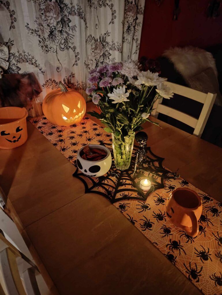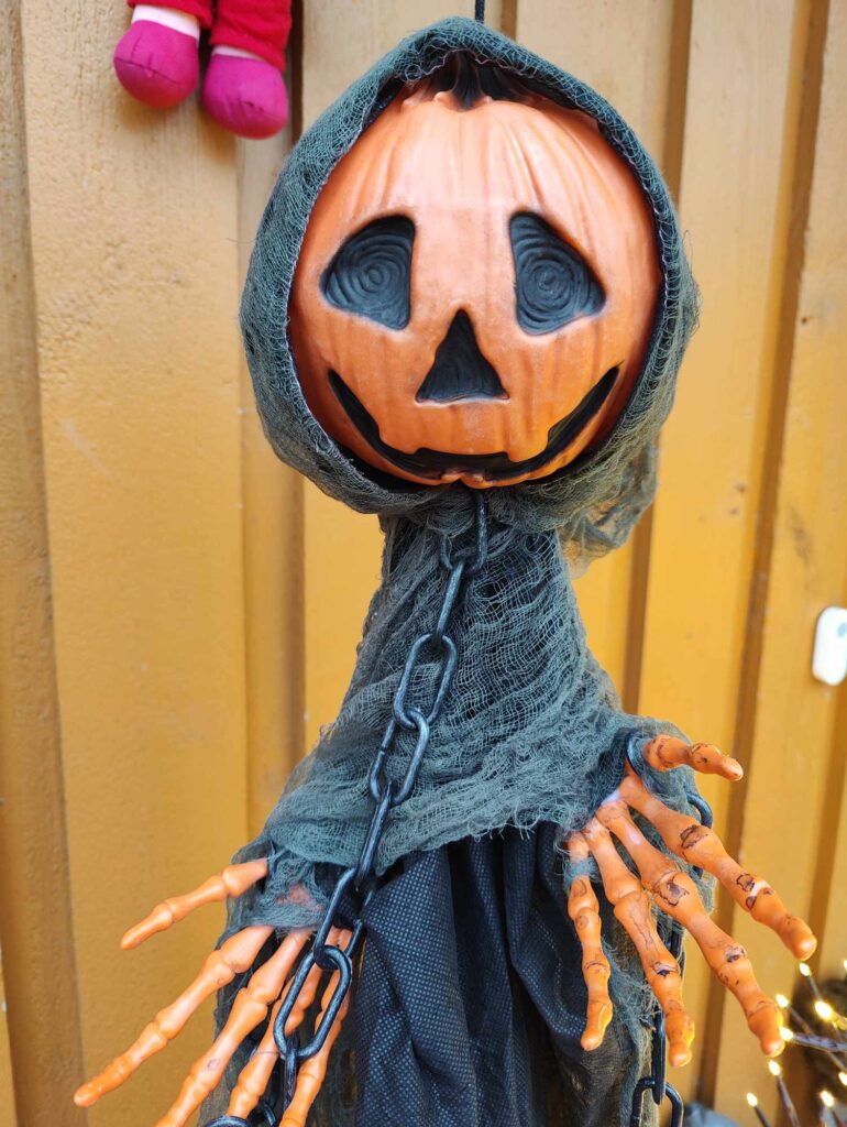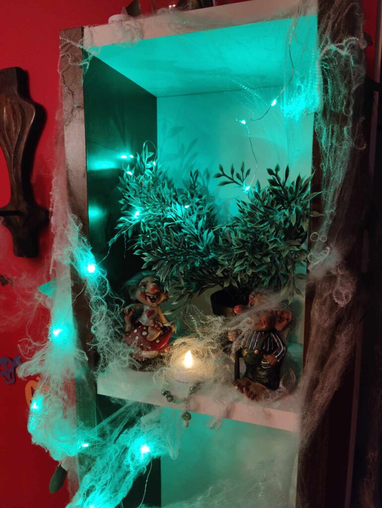 Olen laitellut myös halloweenia pikku hiljaa. Kävin kirppikseltä hakemassa vanhoja nukkeja, ja muokkasin niitä olevinaan karmiviksi. Hämähäkin verkko siellä täällä ja vihreät valot myös toimii.