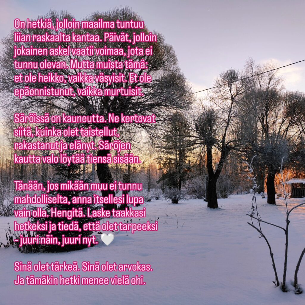 Trauma ei koskaan täysin katoa, mutta sen kanssa voi oppia elämään. Ja vaikka joskus tuntuu, että uuden alun joutuu rakentamaan yhä uudelleen, jokainen alku opettaa jotakin uutta. Minulle se on ollut sitä, että opin rakastamaan itseäni uudelleen ja luottamaan siihen, että elämä kantaa – vaikka toisinaan se horjuisikin.