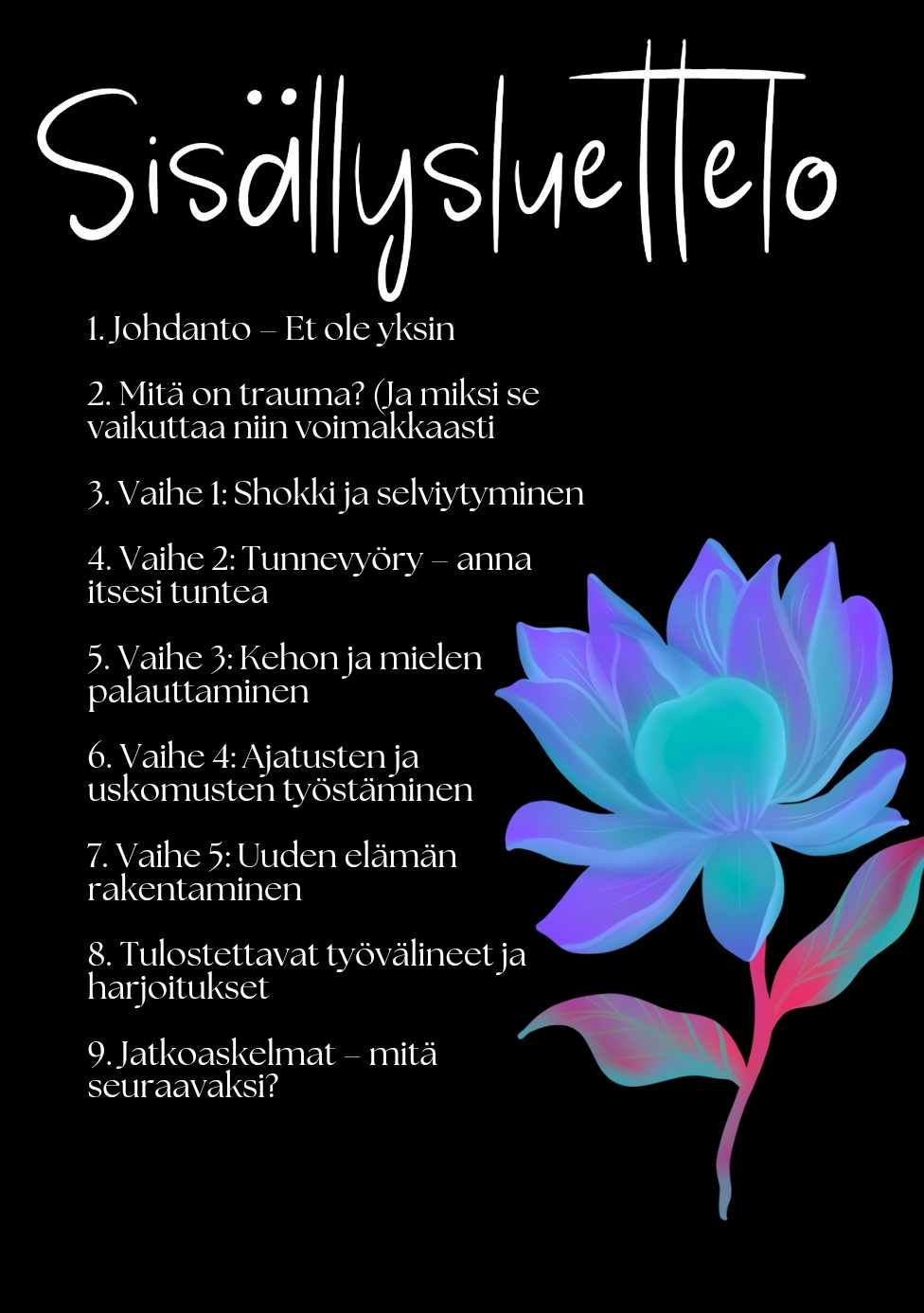 Eteenpäin – Opas traumaattisen kokemuksen jälkeen Tämä lempeä ja käytännönläheinen opas auttaa sinua käsittelemään traumaattisia kokemuksia ja rakentamaan elämää uudelleen. Saat konkreettisia työkaluja tunteiden käsittelyyn, itsesi vahvistamiseen ja tulevaisuuden luomiseen – omaan tahtiisi. Lataa, lue ja löydä voimasi uudelleen!